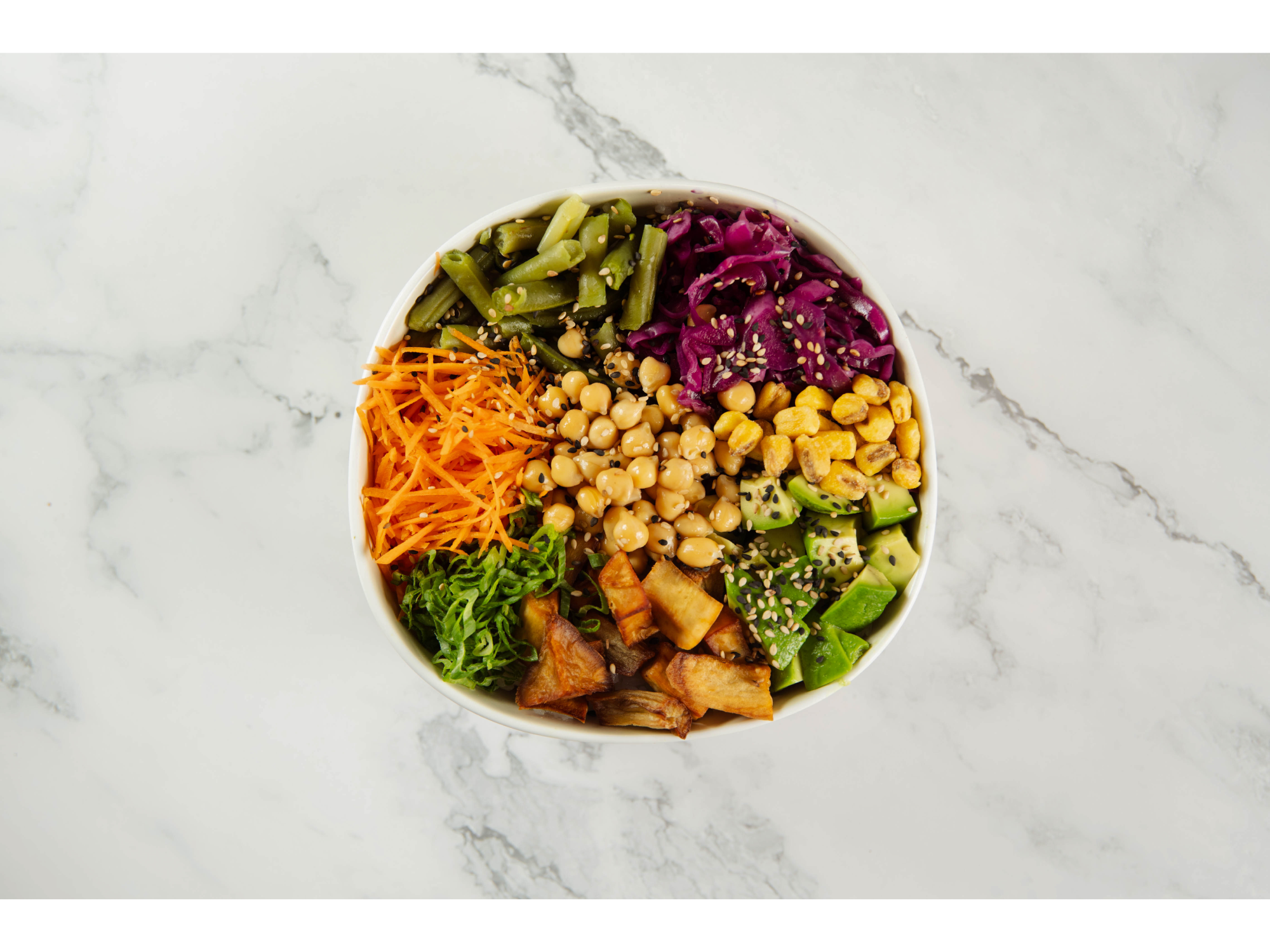 Colchón de arroz, garbanzos, chaucha, zanahoria, palta, repollo avinagrado, batata frita, maiz crocante, cebolla de verdeo cubierto de sasamo integral y negro. Incluye 1 salsa a elección y cubiertos o palitos. Imagen a modo ilustrativo.