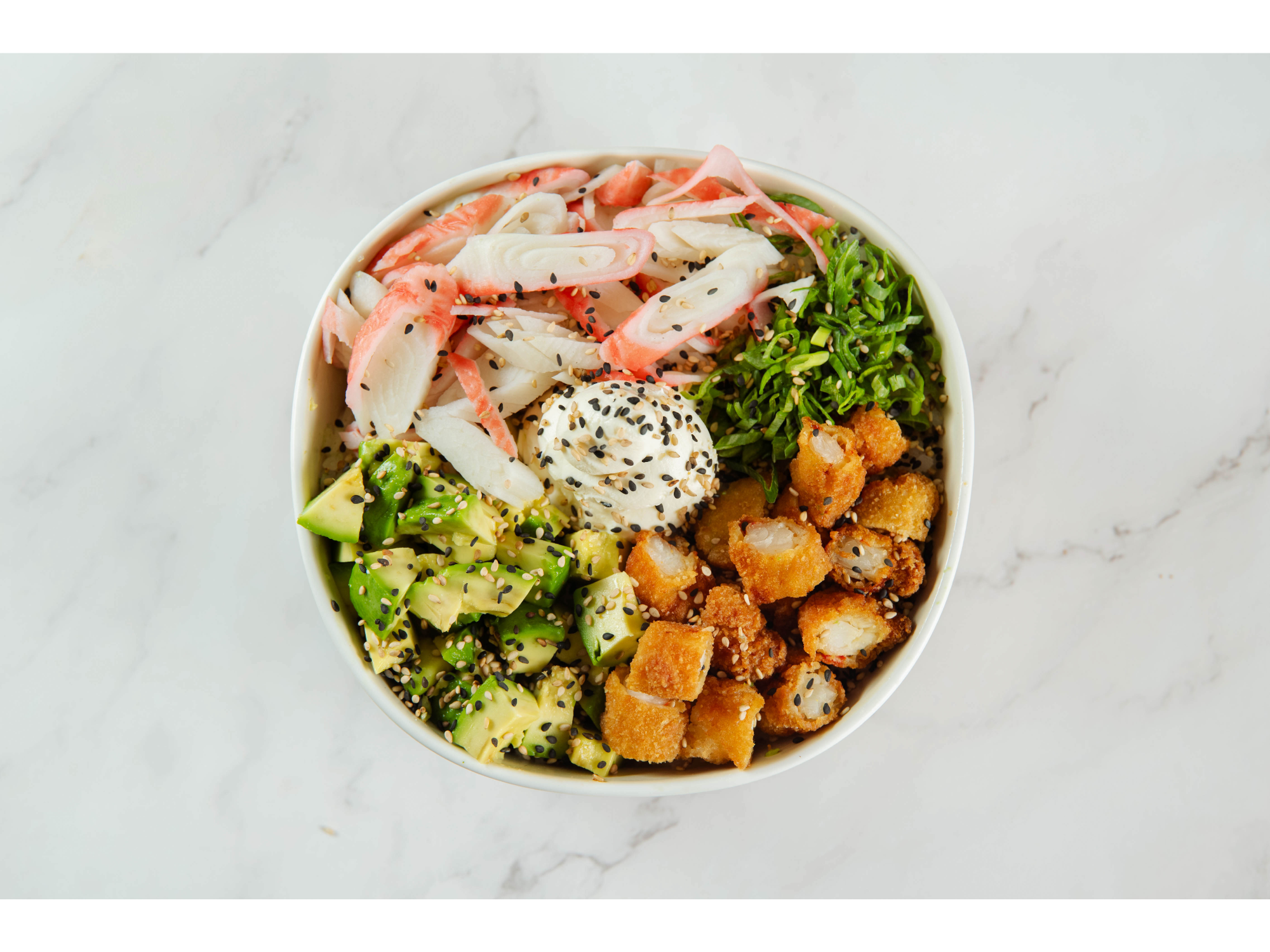Colchón de arroz, langostinos apanados, kanikama, queso philadelphia, palta, cebolla de verdeo y semillas de sésamo.